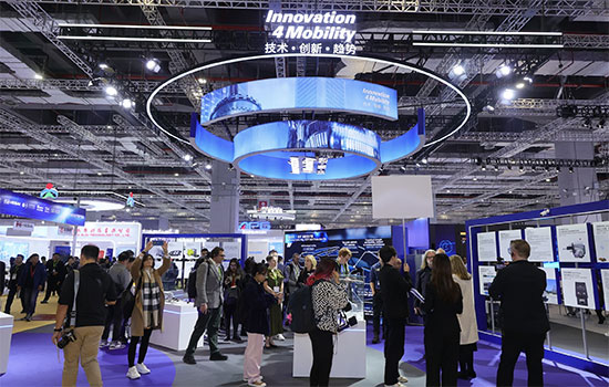 O espaço apresenta produtos e soluções relacionados a veículos elétricos, baterias, condução assistida e tecnologias emergentes.
