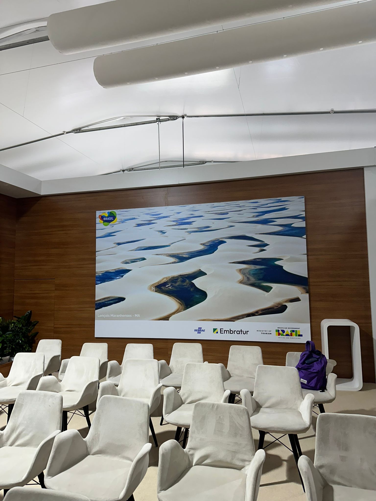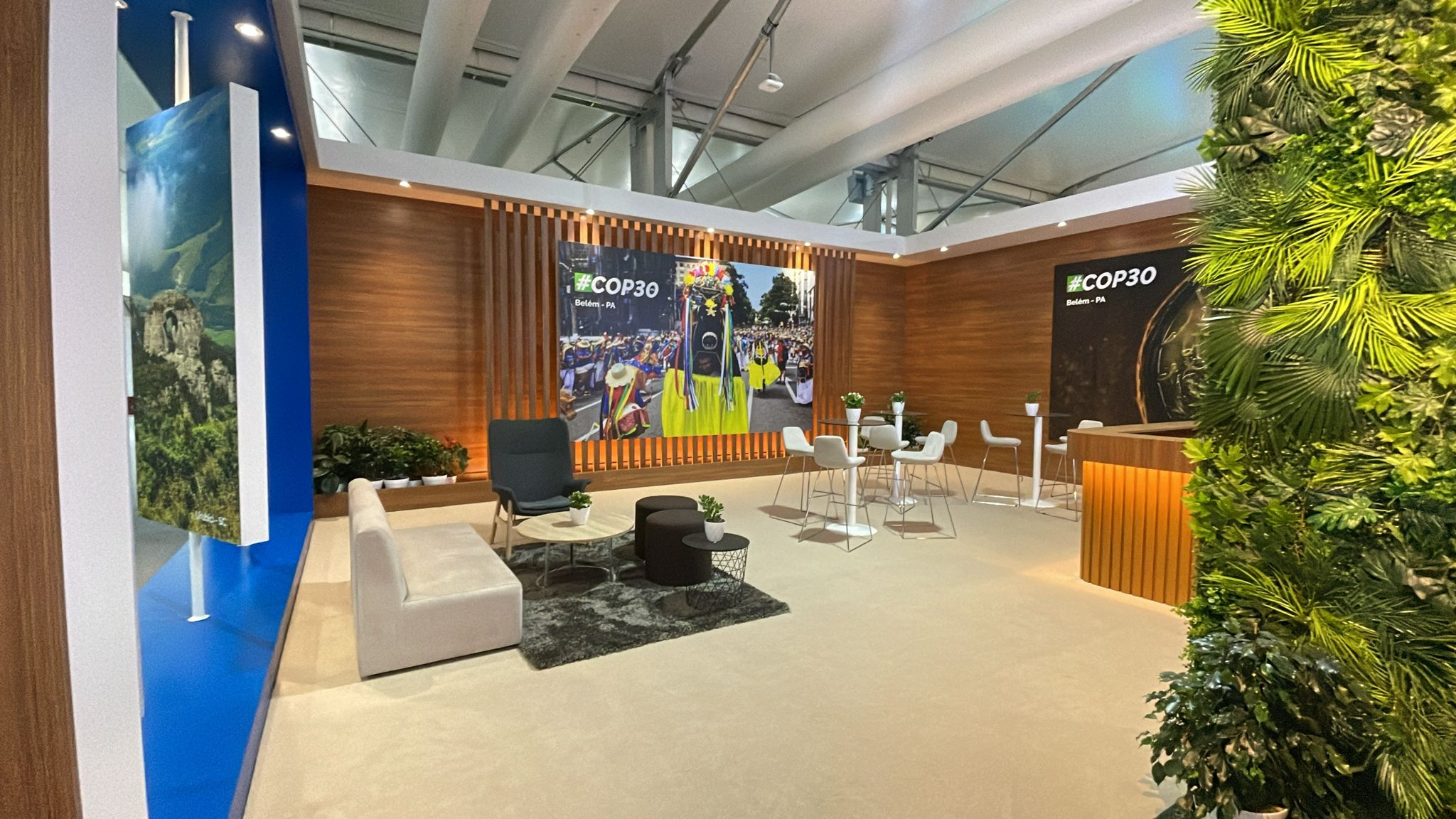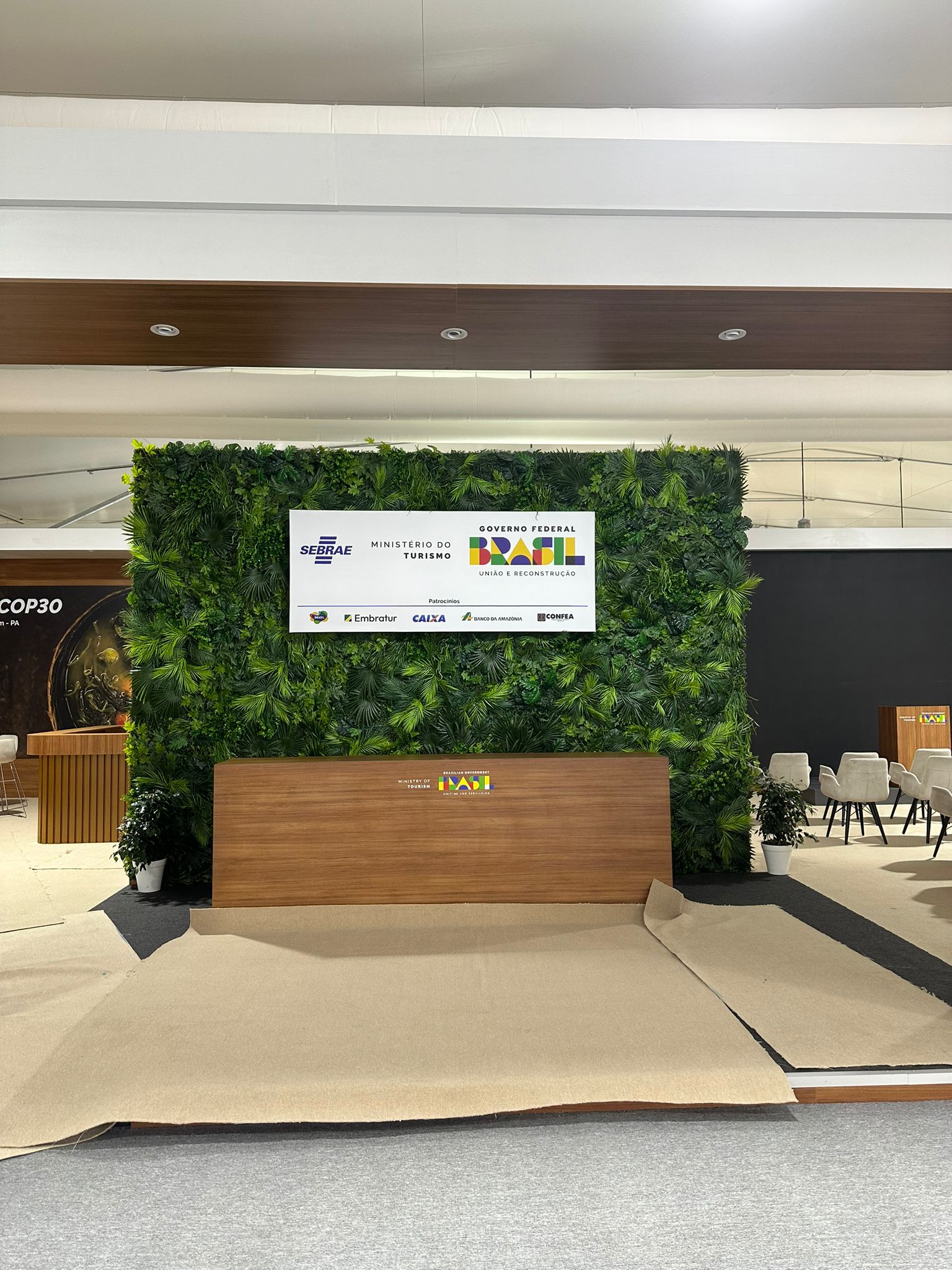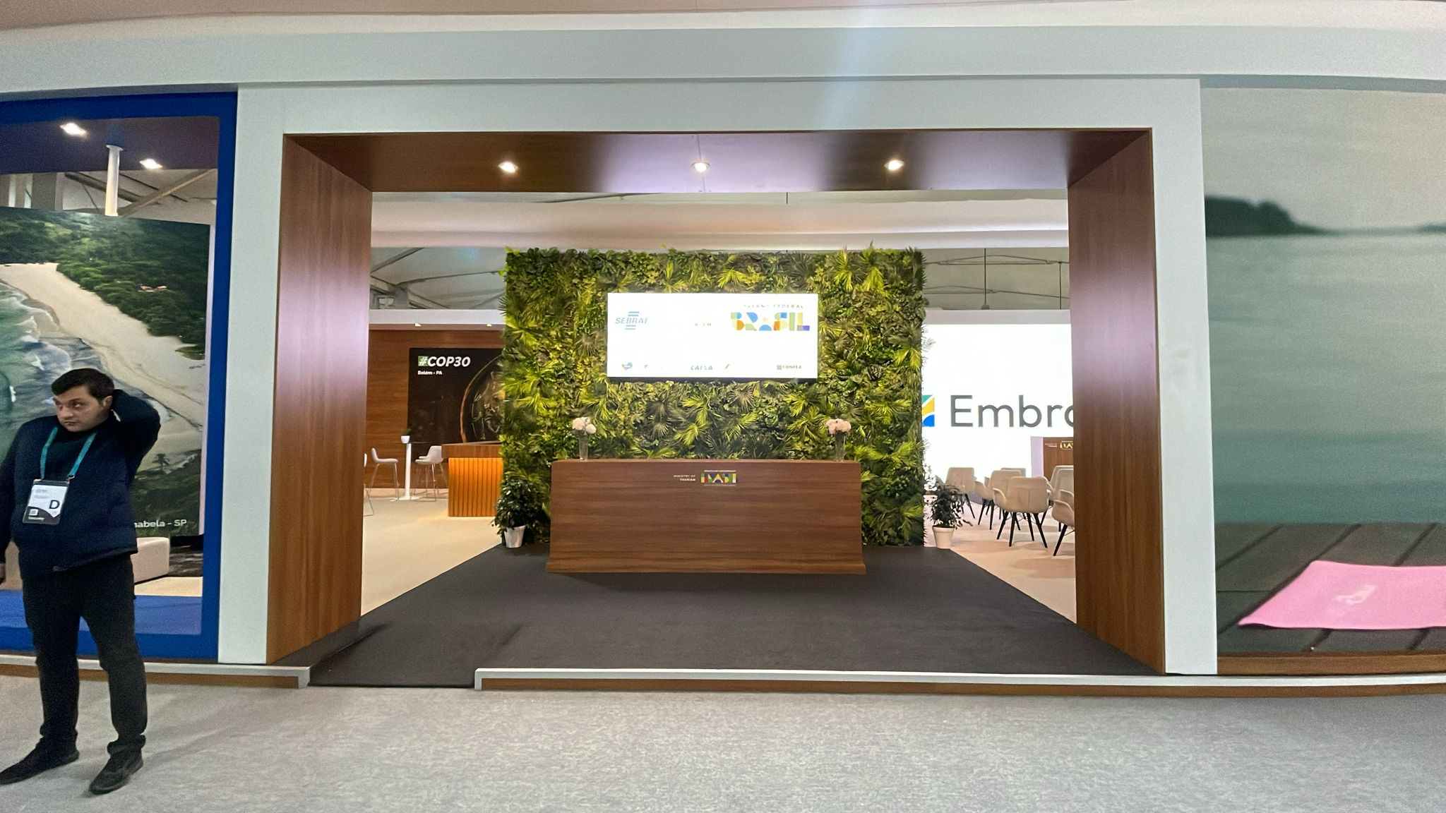 O estande brasileiro, desenhado pela Mchecon Design e Cenografia, oferece um espaço interativo que promove o Brasil como líder no desenvolvimento de um turismo alinhado às metas climáticas globais.