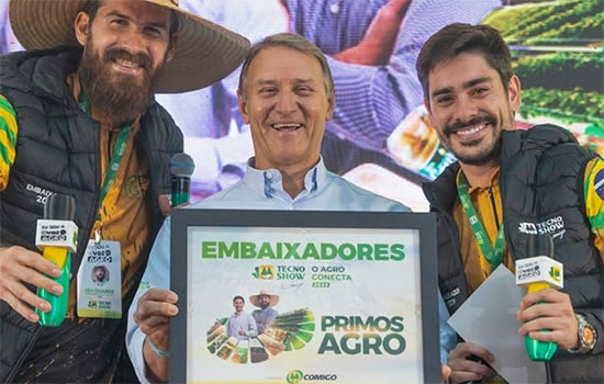 Foram apresentados ainda os influenciadores João Castro e Eduardo Palhares, conhecidos como Primos Agro, como embaixadores oficiais da Tecnoshow 2026.