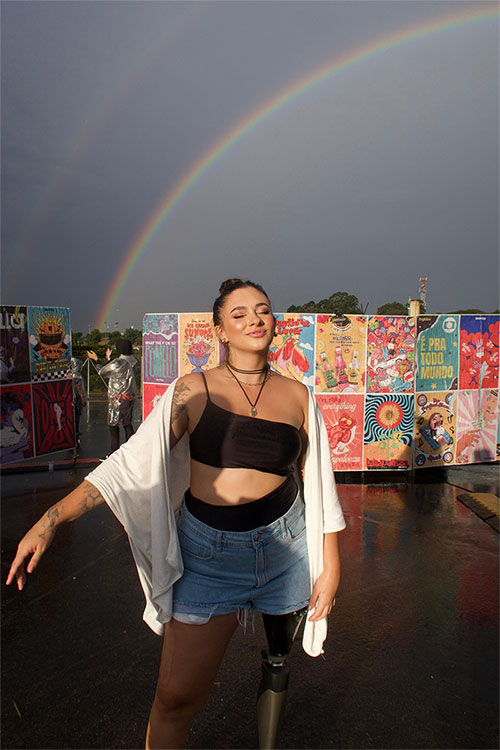 A influenciadora Amanda Valente, usuária de prótese há dois anos, frequenta festivais com regularidade e aponta tanto avanços quanto limitações.