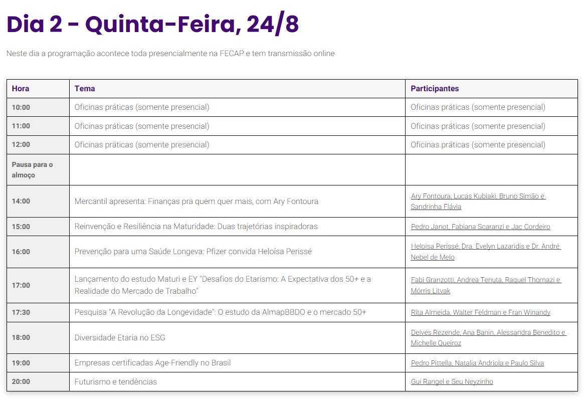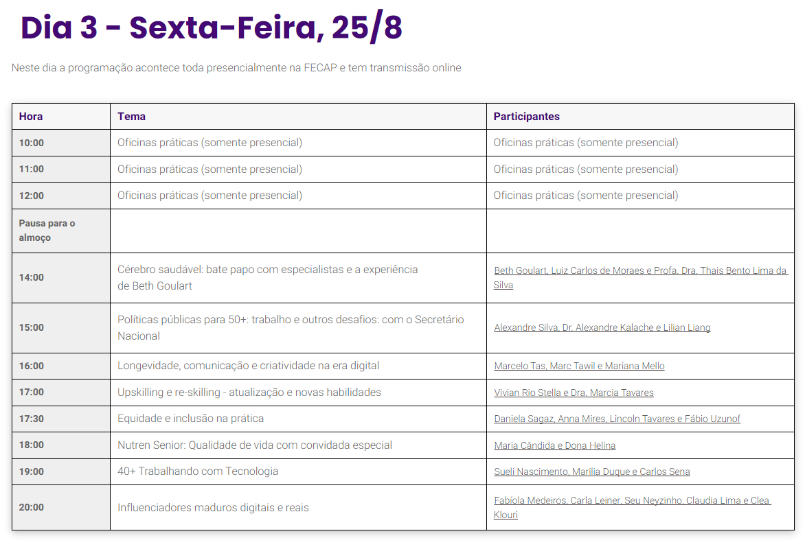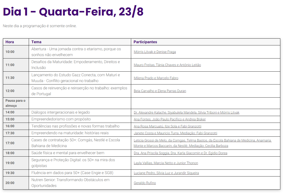 De 23 a 25 de agosto, o público poderá participar de um amplo debate sobre o futuro do trabalho e empreendedorismo 50+ com o objetivo de gerar debate, reflexão, inspiração, dicas práticas e conexões.
