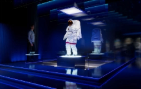 Com iluminação suave e azulada e sonorização como se estivessem dentro da roupa do astronauta, os visitantes vão aguçando mais a visão ao adentrar no espaço até perceberem a imagem da Terra no horizonte.