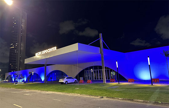 Durante o mês de março, o Recife Expo Center recebe iluminação especial na cor azul escuro em adesão à campanha Março Azul Escuro, dedicada à conscientização sobre o câncer colorretal, um dos tipos de câncer mais incidentes no Brasil e no mundo.